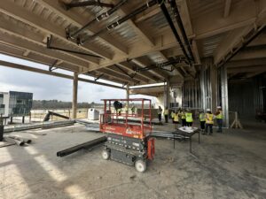 EMCID, SpawGlass, and dozens of others involved in the creation and construction of the district’s 210,070-square-foot convention center participated in a Topping Out Ceremony November 20, 2025. This commemorates a major construction milestone of completing the structural frame and celebrates progress toward finishing the building. For the ceremony, a steel beam was painted so that the project team, construction crews, and EMCID board and staff could sign the beam. The beam was then hoisted into place, completing the frame of the building.