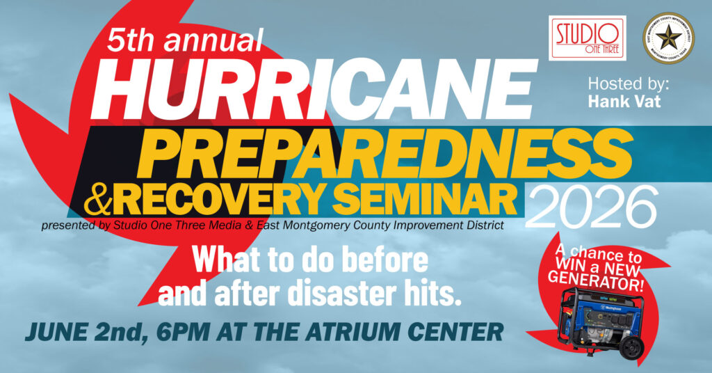 Join East Montgomery County Improvement District and Studio One Three for the FREE fifth Annual Hurricane Preparedness & Recovery Seminar on Tuesday, June 2, at The Atrium Center located at 21575 Hwy. 59 in New Caney.